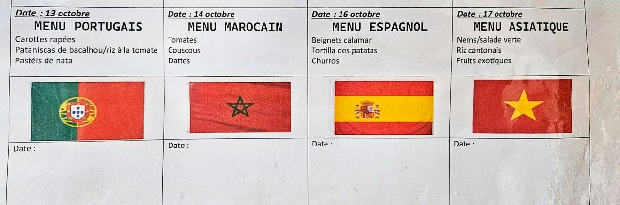Dans le cadre de la semaine du goût, du 13 au 17 octobre, la cantine proposera des menus typiques de certains pays.